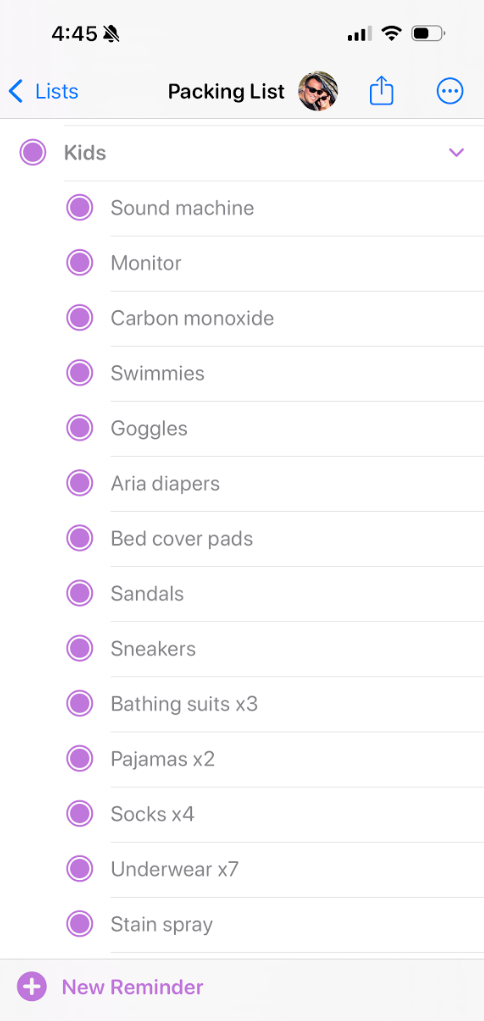 I like using this system in particular because I can reuse my list each time we pack. By clicking the "..." in the upper right corner you can "show completed" and all your checked off items will pop up. Then you can uncheck them and update them as needed for that particular trip.
